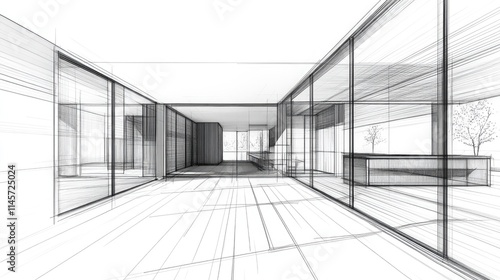 Modern architectural sketch of a house extension featuring large glass windows and open spaces showcasing contemporary design elements