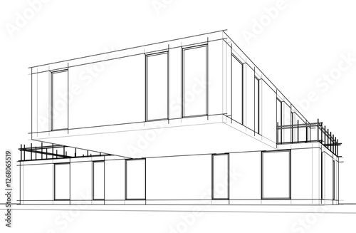 Modern Architectural Wireframe Sketch – Vector Blueprint of Contemporary Building