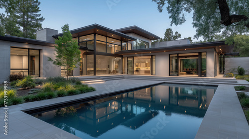 Modern architecture showcases stunning contemporary home with large glass windows, serene pool, and lush landscaping, creating tranquil atmosphere