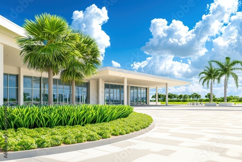 architecture, greenery, building, design, landscape, palm, sky, cloud, modern, patio, relaxation, bright, sunny, tropical, nature, garden, resort, space, symmetry, beauty, environment, detail, urban, calmness