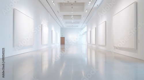 Modern art gallery hall with white walls, large blank canvases, and glossy floors in a minimalist design, well-lit with natural and artificial light.
