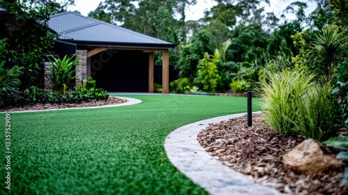 Modern Backyard Landscaping Artificial Turf Timber Edging Lush Greenery