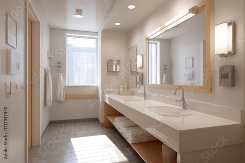bathroom, modern, interior, design, sink, mirror, light, window, towel, clean, aesthetic, relaxation, comfort, contemporary, space, decor, hygiene, fixture, bright, serene, inviting, architecture, style, material, ambience, home, luxury, elegance, minimalism, layout, functionality, organisation, warmth, atmosphere, cleanliness, renovation, calmness, beauty, simplicity, environment, residential, plumbing, accessory, maintenance, flooring, lighting, cabinetry, storage, white