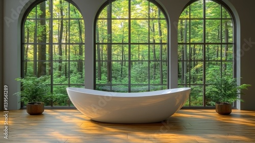 Modern bathroom with large windows showcasing a lush forest view, featuring a freestanding bathtub and wooden floors. Sunlight streams through the windows, creating a warm and inviting ambiance.