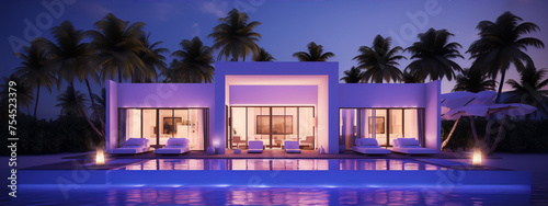 Modern beach house with pool at night, 3d render