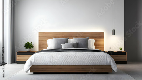 Modern bedroom design with a wooden bed and stylish decor, perfect for relaxation and comfort in a contemporary space.