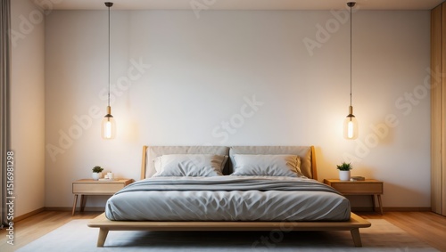 Modern bedroom interior with minimalist design and warm lighting