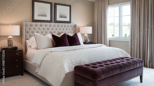 Modern Bedroom Interior with Tufted Headboard and Plush Benches