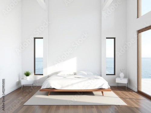 Modern bedroom with a sea view featuring a cozy bed on wood floor, white walls, and stylish decor, wood floor, bedroom