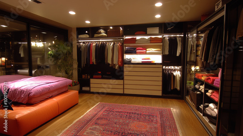 bedchamber, closet, modern, minimalist, organised, clothes, clothing, rack, shelf, bed, pink, duvet, orange, leather, footboard, rug, red, patterned, light, bright, interior design, home decor, stylish, contemporary