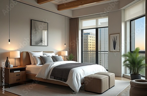 Modern bedroom with large windows overlooking a city skyline, neutral tones, a cozy bed, minimalist decor, and natural light enhancing the serene ambiance