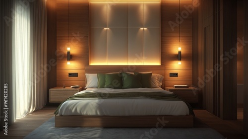 modern, bedchamber, wooden, headboard, white, bedding, green, pillow, warm, glow, wall-mounted, lamp, cosy, retreat, inviting, interior, design, home, decor, relaxation, comfortable, stylish, minimal, tranquil, serene, soft, lighting, bed, furniture, contemporary, neutral, colours, restful, peaceful, elegant, simplicity, luxury, space, sleep, rest, architecture, nobody
