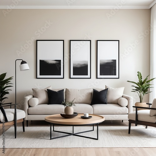 modern, living room, interior, beige, sofa, couch, cushion, pillow, black, white, print, abstract art, coffee table, rug, carpet, floor, plant, greenery, armchair, chair, home decor, minimalist, contemporary, stylish, elegant, comfortable, relaxing