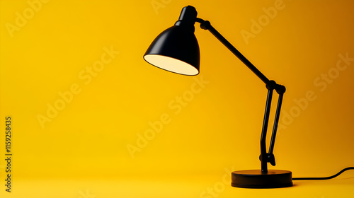 modern black desk lamp illuminated on vibrant yellow background, minimalist home office lighting, stylish adjustable task lamp for workspace or study room decor