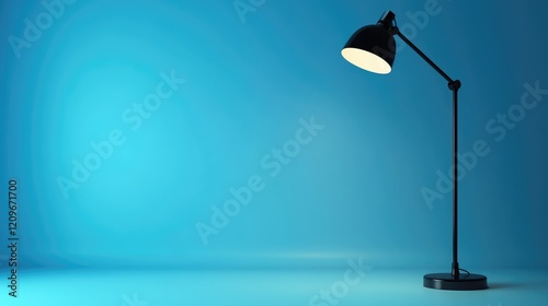 Modern Black Metal Desk Lamp Illuminated on Soft Gradient Blue Background in Studio Setting with Smooth Lighting Effects