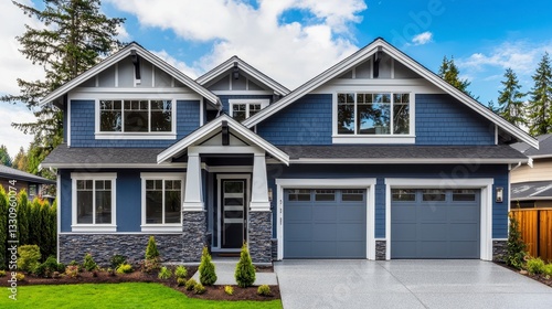 Modern Blue House with Two Garage Doors and Lush Green Landscape