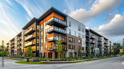 Modern Brick and Steel Apartment Building Complex at Sunset