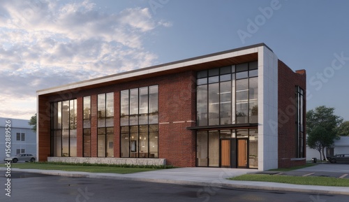 building, office, modern, brick, facades, glasses, architecture, exterior, design, contemporary, structure, commercial, front, urban, window, entrance, door, parking, street, landscape, ground, city, business