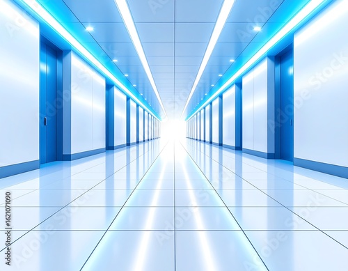 hallway, corridor, modern, architecture, future, light, blue, technology, futuristic, illuminated, design, clean, empty, perspective, space, wide, bright, smooth, contemporary, polished, elevator, interior, commercial, office, industrial