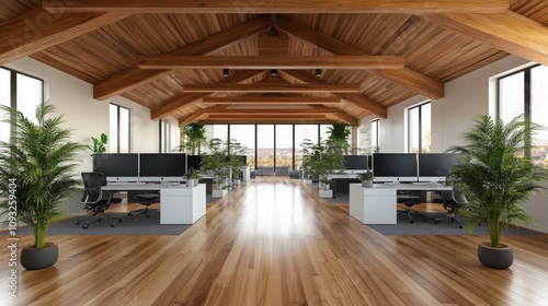 Modern, bright office space with exposed wooden beams, large windows offering scenic views, and stylish workstations. Potted plants add a touch of nature to the contemporary design.