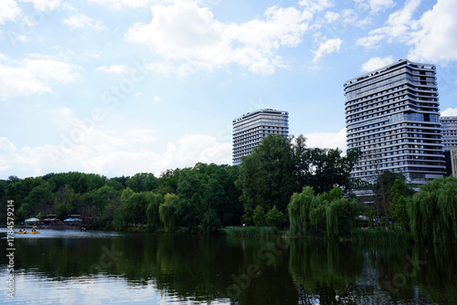 building, architecture, city, sky, construction, urban, apartment, skyscraper, building, exterior, house, residential, new, glasses, high, window, tall, office, business, blue, window, home, kiev, ukraine, river, city landscape, lake, view, tower, duck pond, skyscraper, tree, park, skyline, water