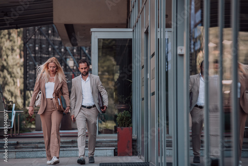 Modern business couple after a long day's work, walking together towards the comfort of their home, embodying the perfect blend of professional success and personal contentment.