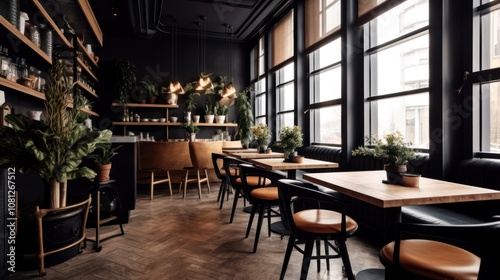 cafes, eatery, interior, design, modern, minimalist, black, wall, window, natural, light, wood, floor, table, chair, plant, potted, green, brown, leather, metal, furniture, lighting, lamp, decor, contemporary, style, space, ambience, warm, cosy, industrial, chic, urban, stylish, elegant, aesthetic, photo, photo, image, visual, art