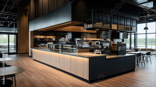 Modern cafe interior with wooden panels and sleek design featuring a coffee counter, seating area, and large windows providing natural light and outdoor view.