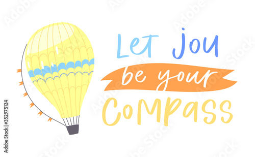 Modern calligraphy unique handdrawn quote. Colorful air balloon with basket with written adventure phrases, slogans. Vector illustration of traveling for posters, cards etc.