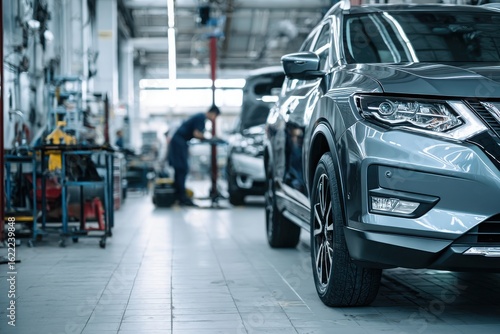 Modern car being serviced in a clean, well-lit automotive workshop auto service garage, showcasing maintenance, diagnostics, and mechanical repair environment.