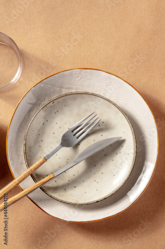 Modern ceramic plates with cutlery, shot from above with a place for text. Trendy dinner setting