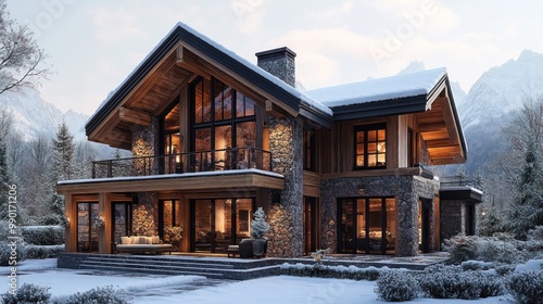 house, architecture, winter, snow, mountain, tree, design, wood, stone, glasses, balcony, cosy, exterior, landscape, nature, residential, lighting, warmth, retreat, peaceful, structure, luxury, cabin, rustic, environment, scenery, home, comfort, aesthetic, view, contemporary, elegant, relaxation, setting, calmness, seasonal, vacation, get-away, family, space, harmony, style, beauty, craftsmanship, atmosphere, privacy
