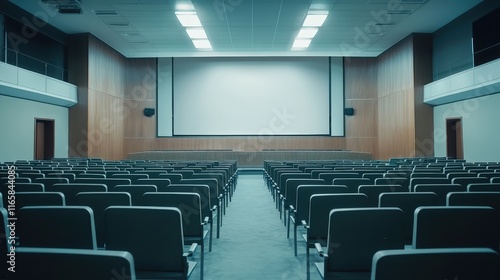 Modern Cinema Hall With Gray Seats, Large Projection Screen, and Contemporary Wood Paneling, Featuring Spacious Symmetry and a Serene, Unoccupied Viewing Environment.