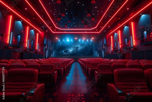 Modern Cinema Hall with Starry Ceiling and Red Seats