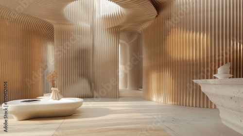 modern, interior, fluted, wood, artistic, decor, circular, space, texture, minimalist, panel, design, contemporary, harmony, shape, architecture, elegance, simplicity, curve, organic, style, chic, luxurious, craftsmanship, residential, sculptural, smooth, serene, neutral, tone, round, natural, material, trendy, fashionable, aesthetic, tranquil, unique