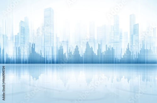 Modern city skyline reflected on a smooth surface. Abstract, light-blue tones, minimalist style. Skyscrapers, geometric shapes
