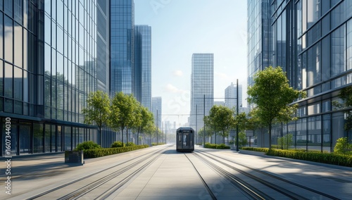 Modern city street with tram. Urban cityscape, glass towers, light-filled day