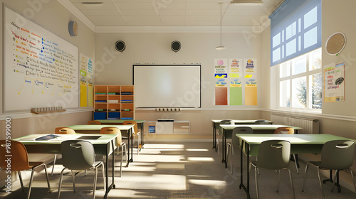 classroom, school, desk, chair, whiteboard, window, bookshelf, education, learning, student, teacher, school supplies, bright, sunny