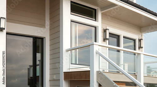 Modern Coastal Home Exterior: Architectural Design and Details. Luxury Real Estate, New Construction, Contemporary Home with Glass Balcony and Modern Facade.