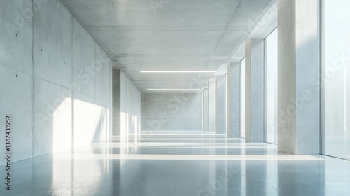 Modern concrete hall with glowing windows, embodying simplicity and clean minimalism in architectural design.