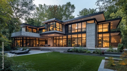 house, modern, concrete, window, glasses, patio, backyard, lawn, grass, landscaping, tree, foliage, garden, light, dusk, evening, exterior, architecture, home, design, contemporary, style, minimalist, elegant, luxury, residential, pool, stone, step, balcony, lighting, structure, night, sky, deck, water, sidewalk, path, plant, flower, green, grey, black, white, dark, light
