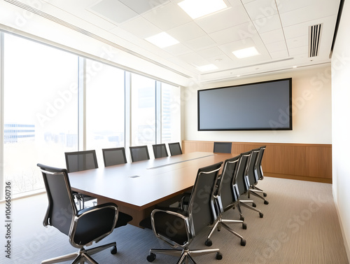 modern conference room featuring large screen, sleek design, and ample natural light. spacious layout is ideal for meetings and presentations, creating professional atmosphere