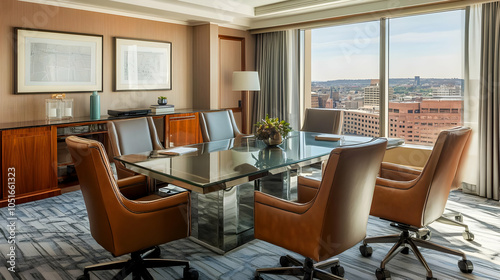 conference, room, table, chair, window, view, city, office, furniture, design, decor, lighting, meeting, professional, workspace, corporate, environment, interior, style, arrangement, organisation, comfort, aesthetic, urban, space, ambience, seating, plant, wood, glasses, wall, floor, carpet, technology, communication, collaboration, strategy, planning, productivity, team