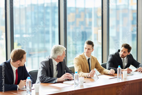 Modern confident business executives in formal suits sitting at conference table and arguing at meeting while discussing company development