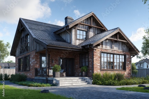 Modern cottage house with rustic charm surrounded by greenery in a tranquil setting during a bright sunny day