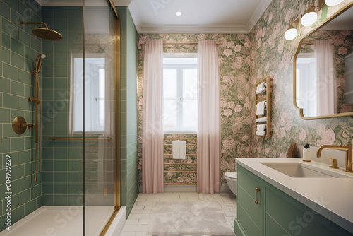 interior, room, bathroom, classic, provence, home, house, design, shower, hotel, lounge, bathe, pastel, daylight, photo, pink, olive, wallpaper, floral, cosy, female, luxury, window, furniture, floor, apartment, wall, three-dimensional, realistic, background, illustration, architecture, decor, sink, mirror, tile, privies, contemporary, clean, tile, new, bathtub, light