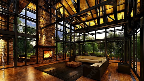 Modern Cozy Living Room with Glass Walls and Fireplace Overlooking Lush Garden at Sunset