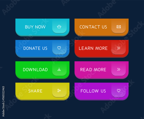 Modern CTA button set, texts and icons, 3D effect, web UI element for landing pages, mobile apps or banners.