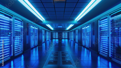 Modern Data Center with Blue LED Lighting