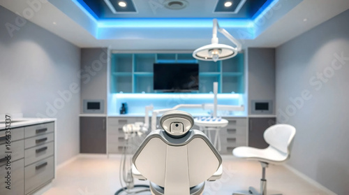 Modern Dental Clinic, Dentist chair and other accessories used by dentists in blue medical light.